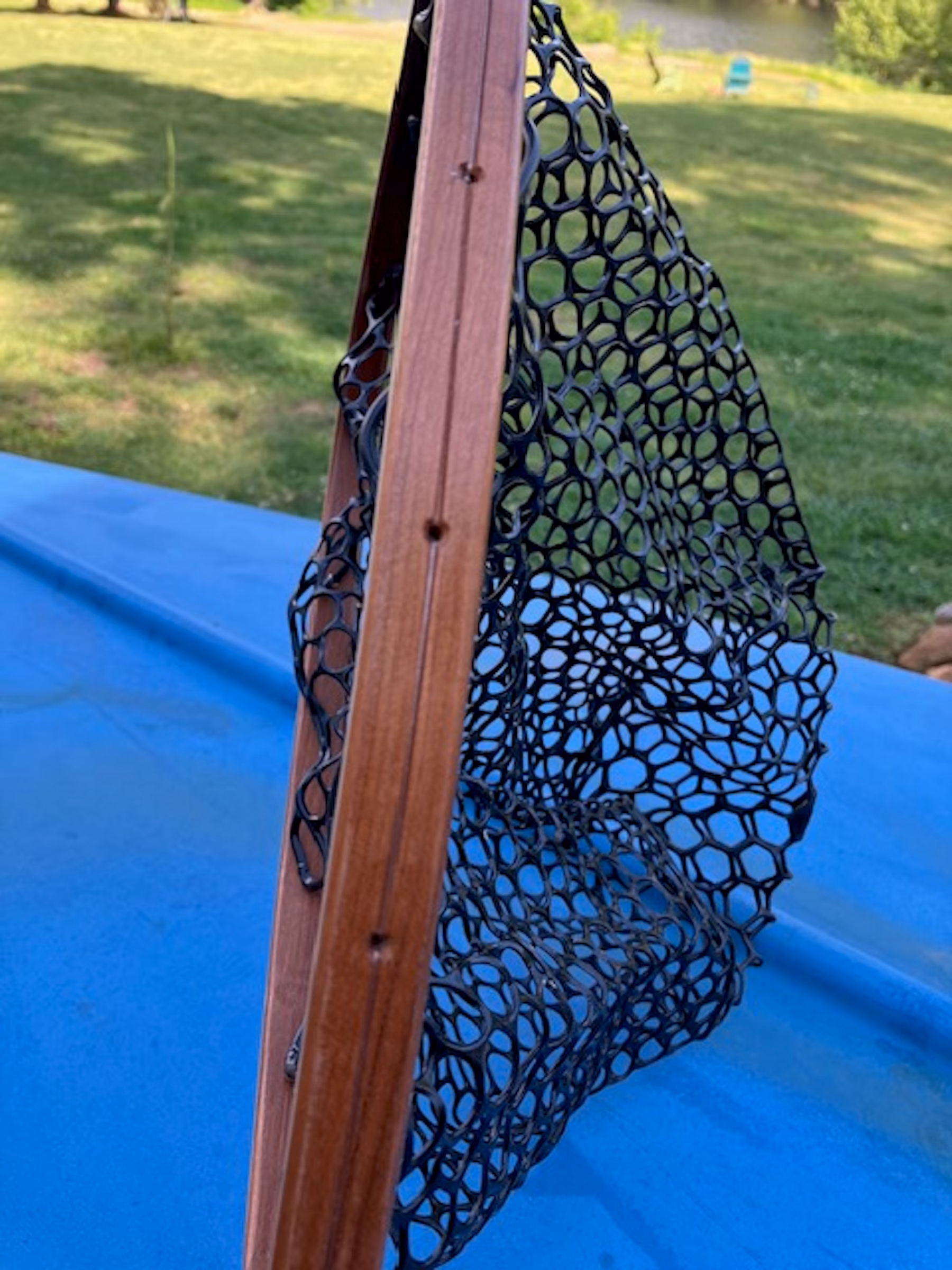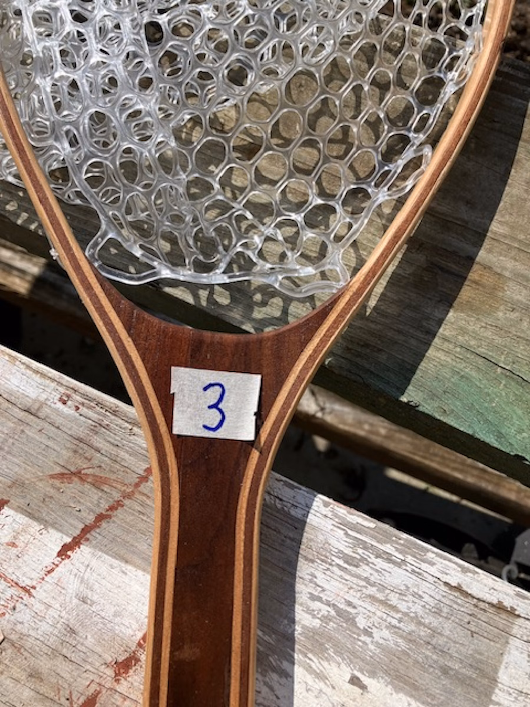 - this net is made with 2 laminations of hickory and 1 lamination of walnut and a walnut center handle
