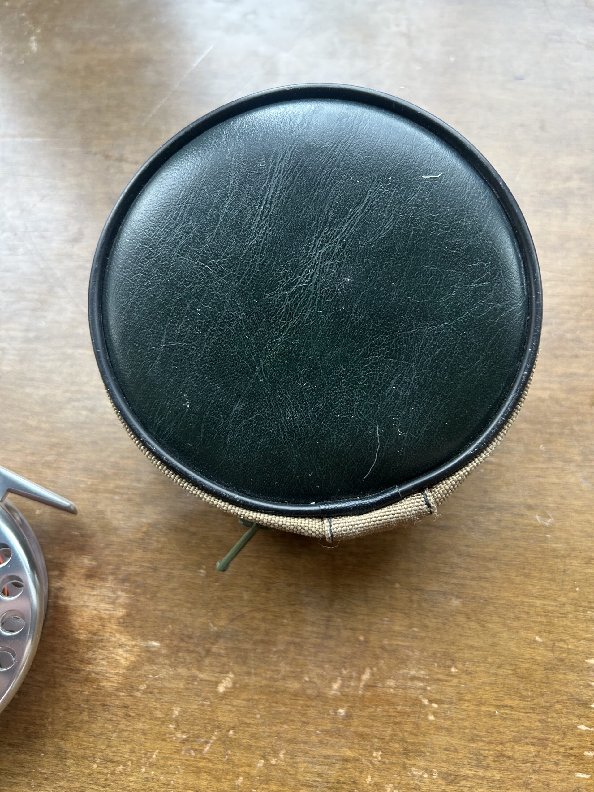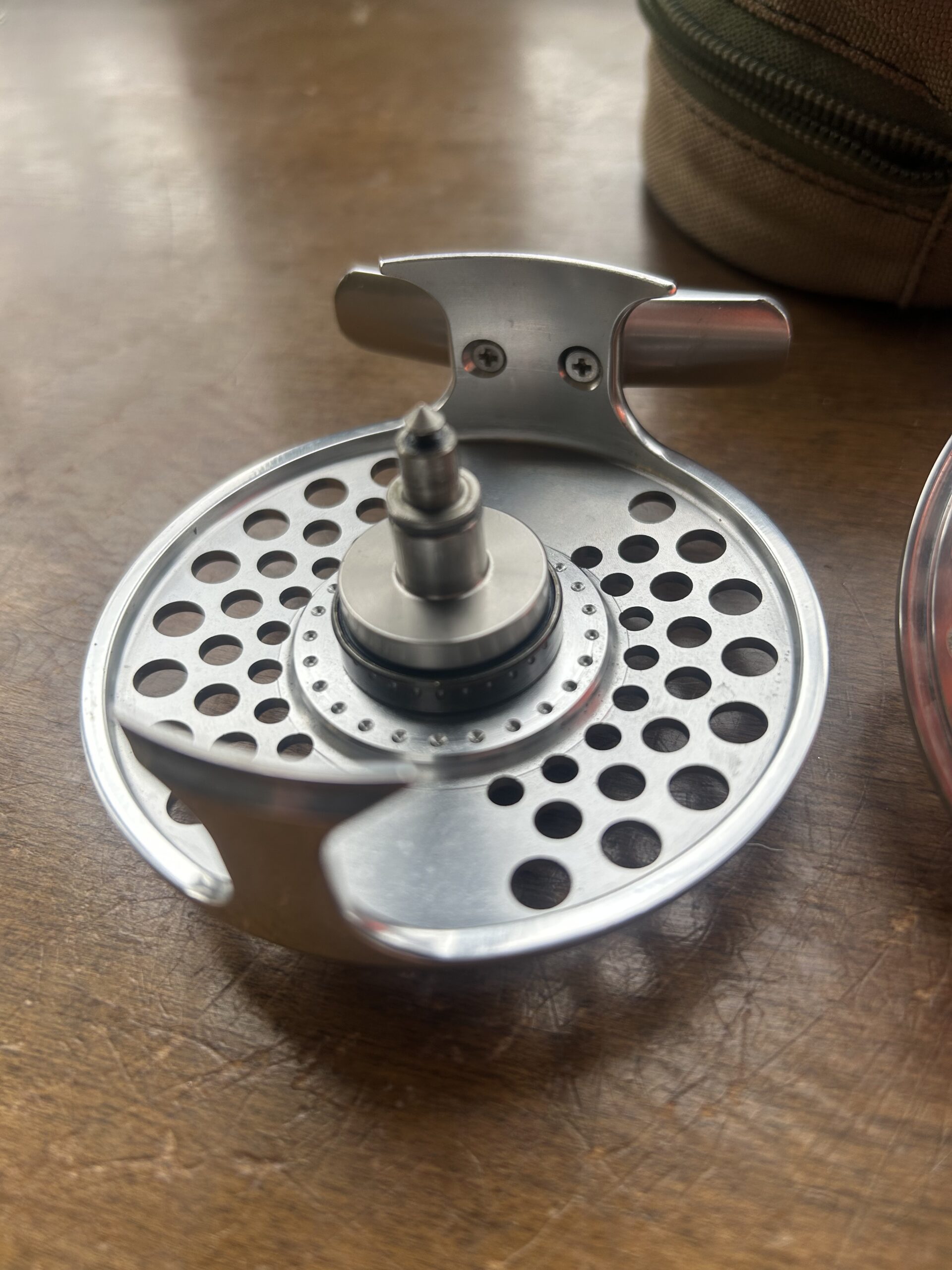 Chrome finish with a few areas with minor scuff/superficial scratches. Works like a dream – super smooth reeling action with a satisfying click.