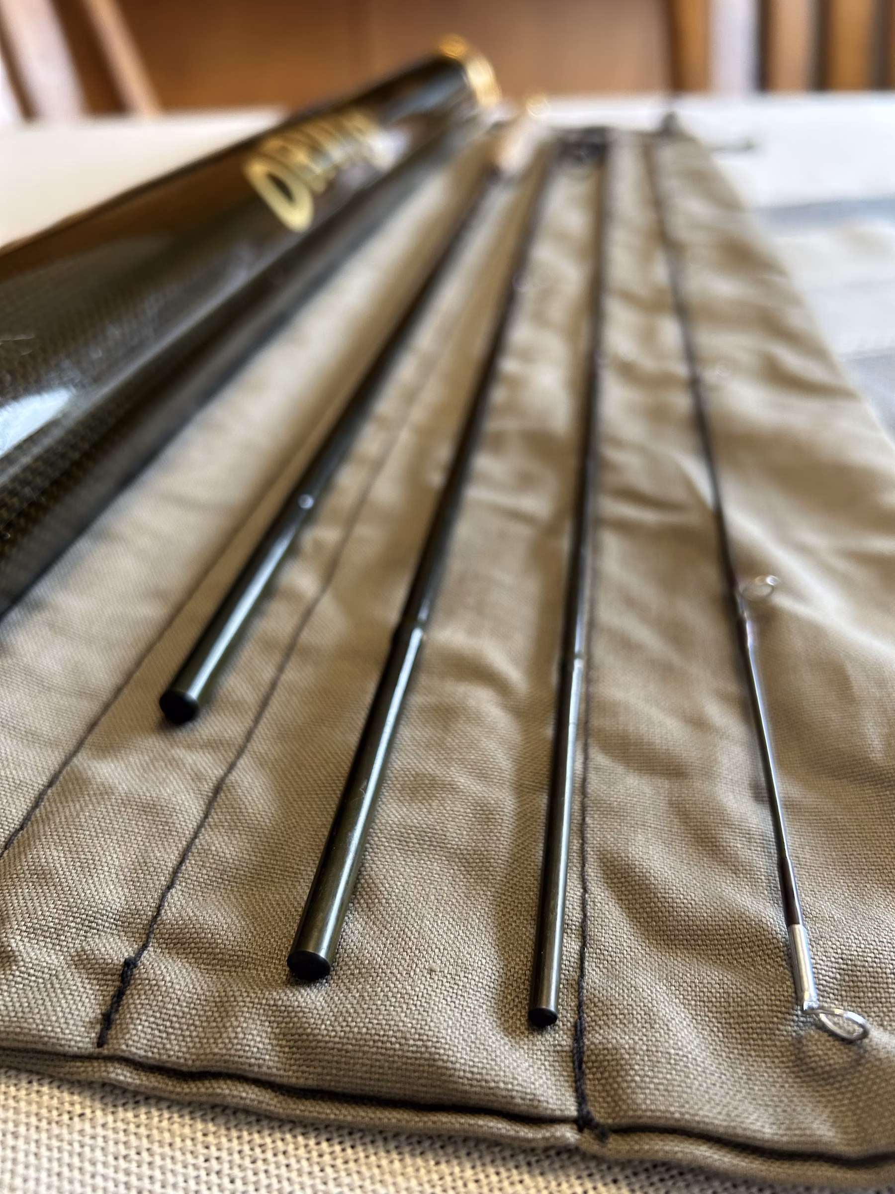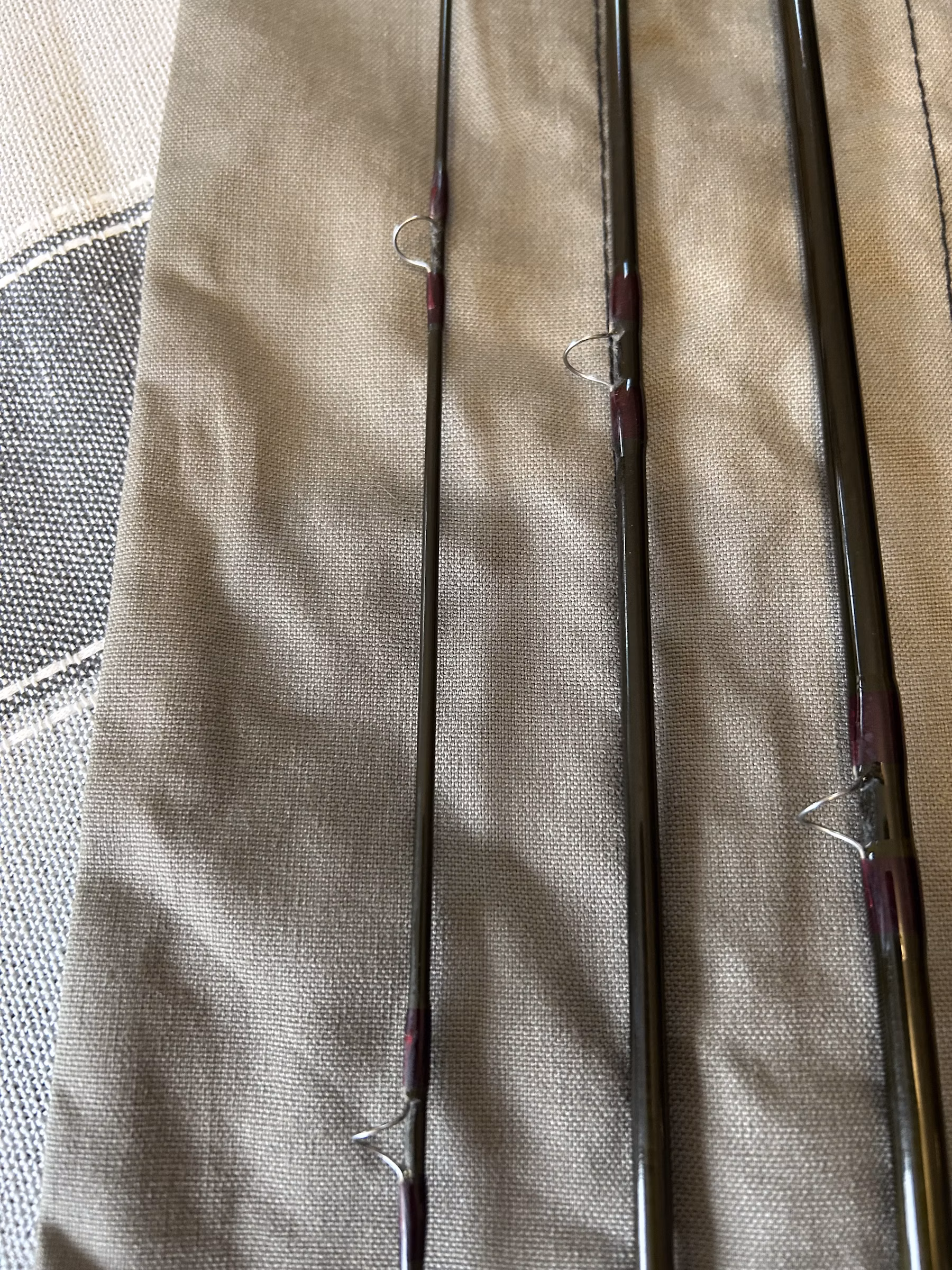 Fisher one season and well cared for. Rod is in excellent condition, and the carry tube is in good condition (see pics for a few dings). Don’t let the Mid-Flex fool you – this is a med-fast action rod that performs better with a higher line wt (I fish a 7wt line on this guy). Beautifully crafted and stunning colors (dark olive & ox blood on the blanks – and crisp gold hardware).