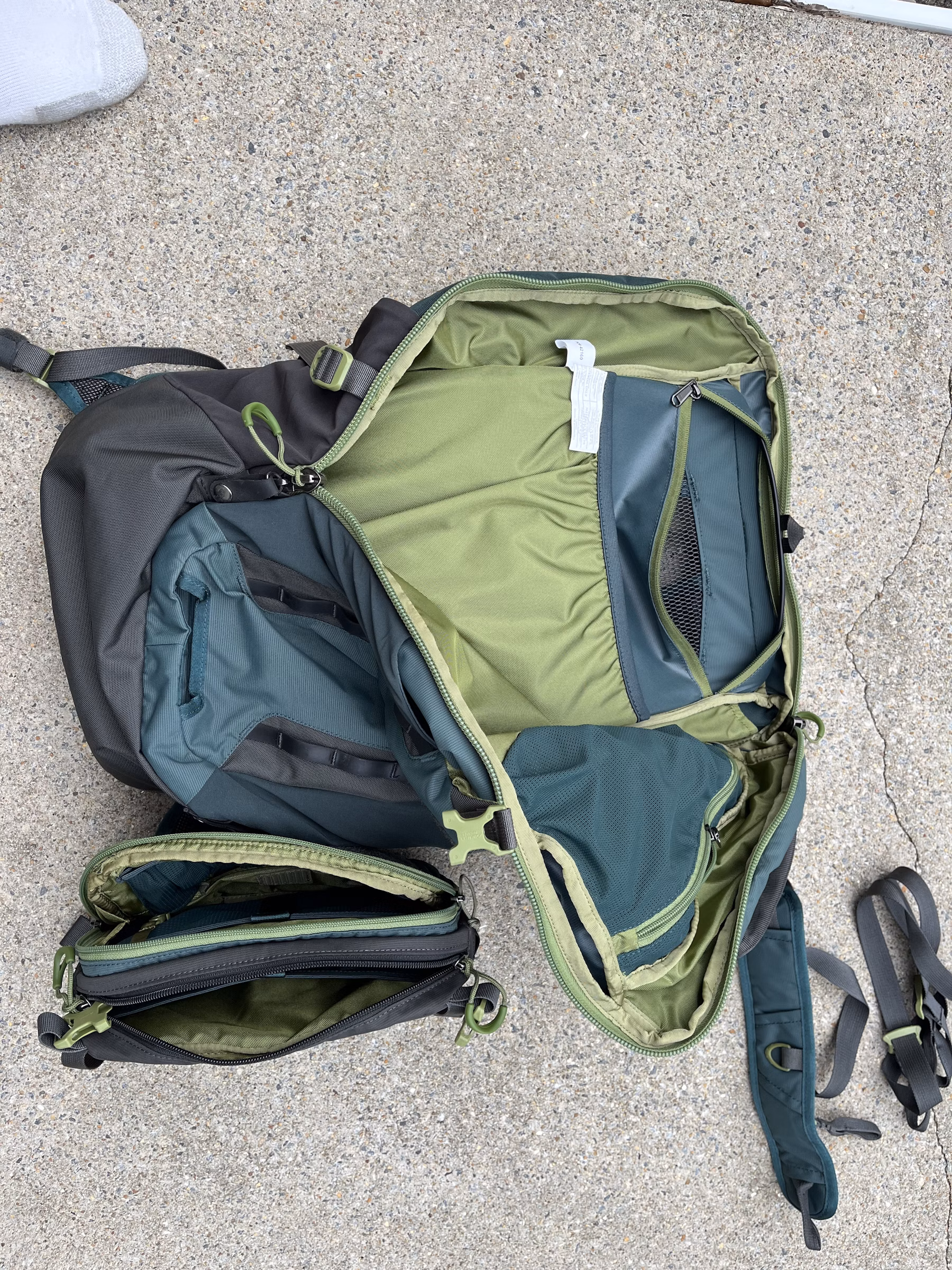 Simms Freestone 35L in Shadow Green. Fishing/ hiking pack w/ wire frame chassis to ventilate and for load distribution. Panel loading design w/ fishing-specific cargo layout. Magnetic tool docking. Fly box pockets and hydration pocket. Includes clip-on chest pack, which also can be carried as waist or sling pack. Used only once in Snake River backcountry